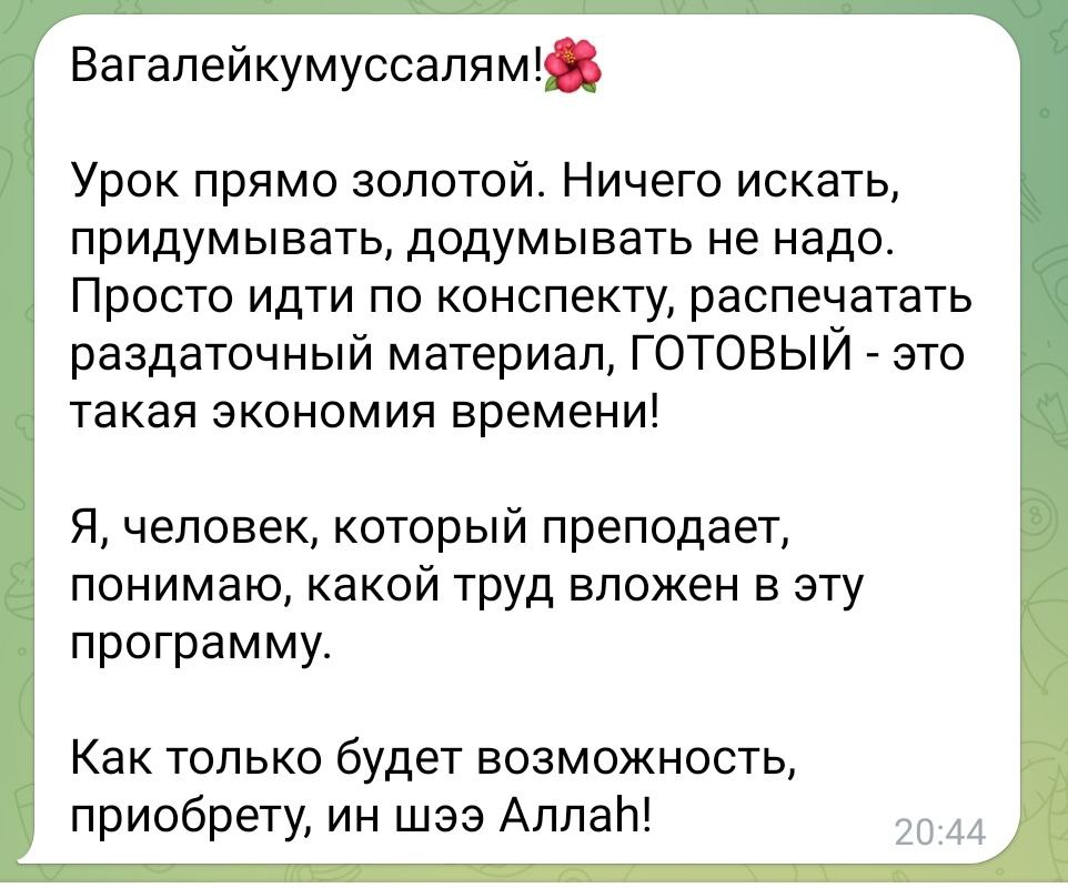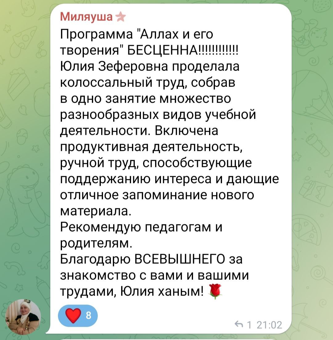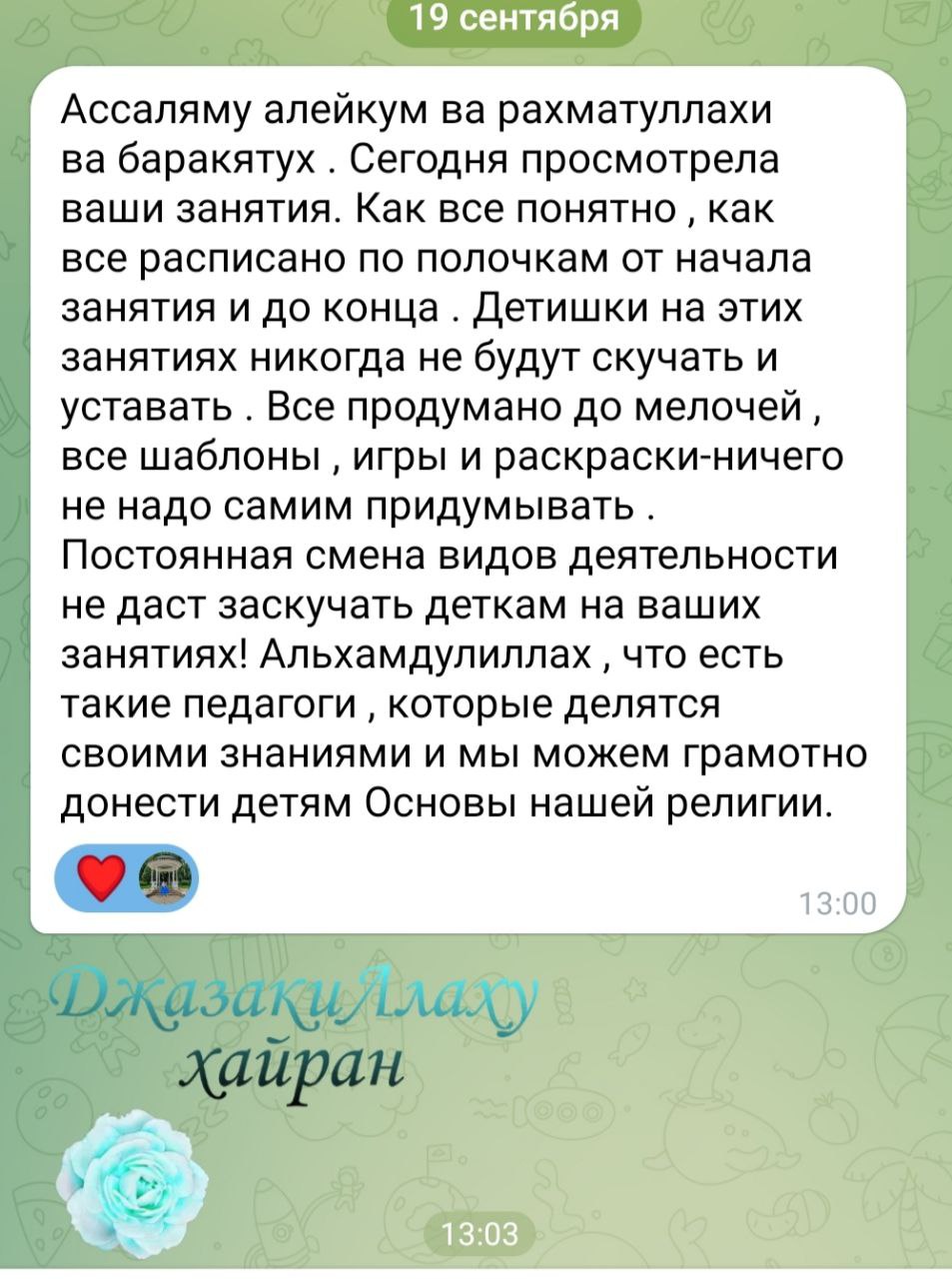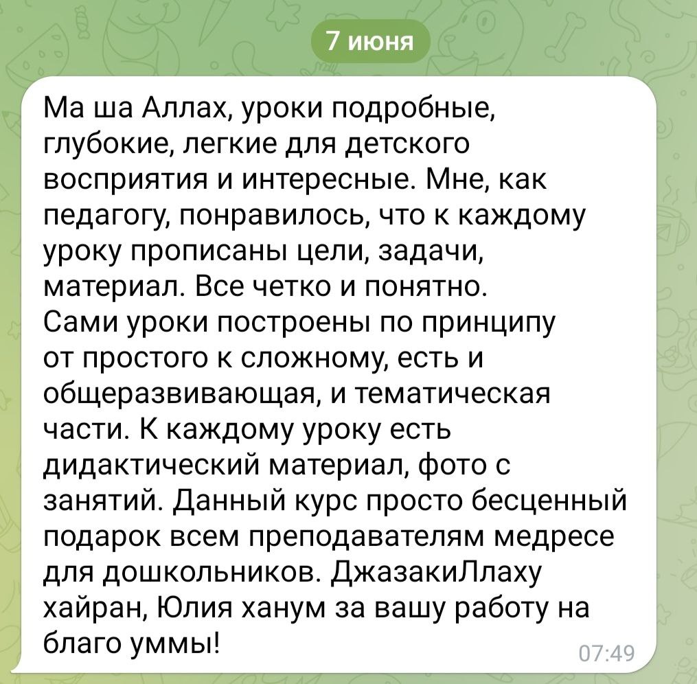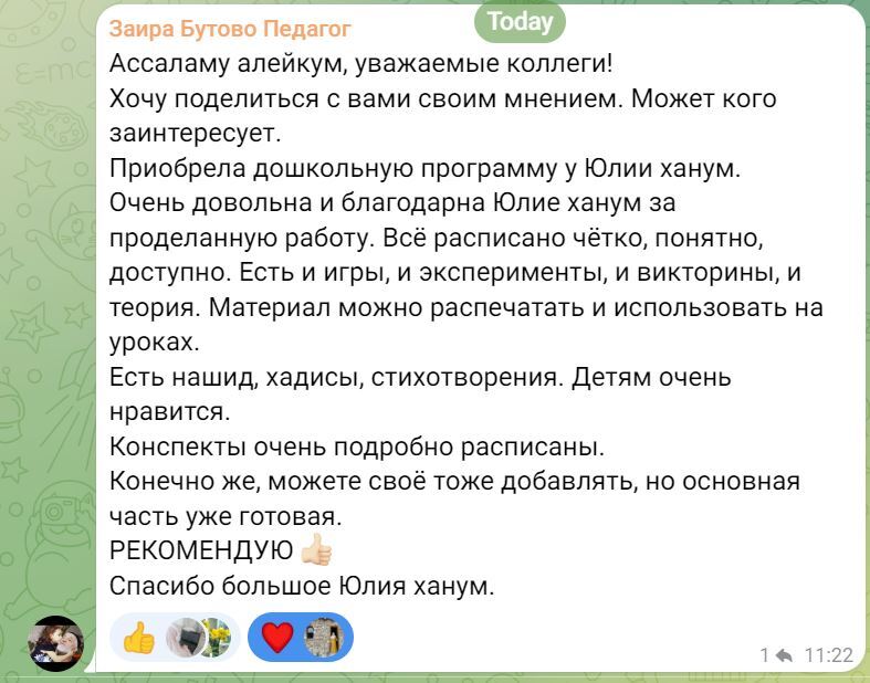 Отзыв коллеги: Ассаламу алейкум, уважаемые коллеги! Хочу поделиться с вами своим мнением. Может кого заинтересует. Приобрела дошкольную программу у Юлии ханум. Очень довольна и благодарна Юлие ханум за проделанную работу. Всё расписано чётко, понятно, доступно. Есть и игры, и эксперименты, и викторины, и теория. Материал можно распечатать и использовать на уроках. Есть нашид, хадисы, стихотворения. Детям очень нравится. Конспекты очень подробно расписаны. Конечно же, можете своё тоже добавлять, но основная часть уже готовая. РЕКОМЕНДУЮ