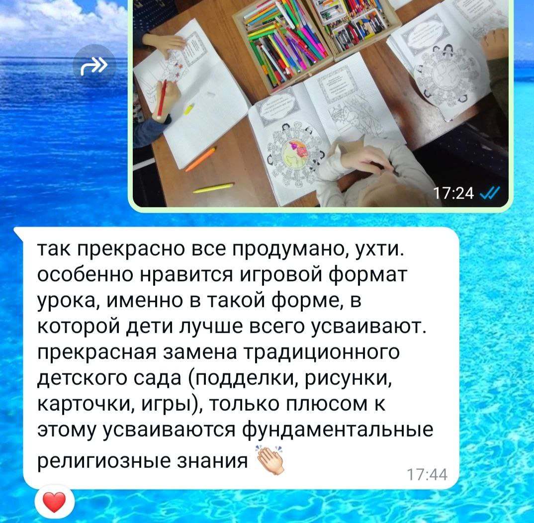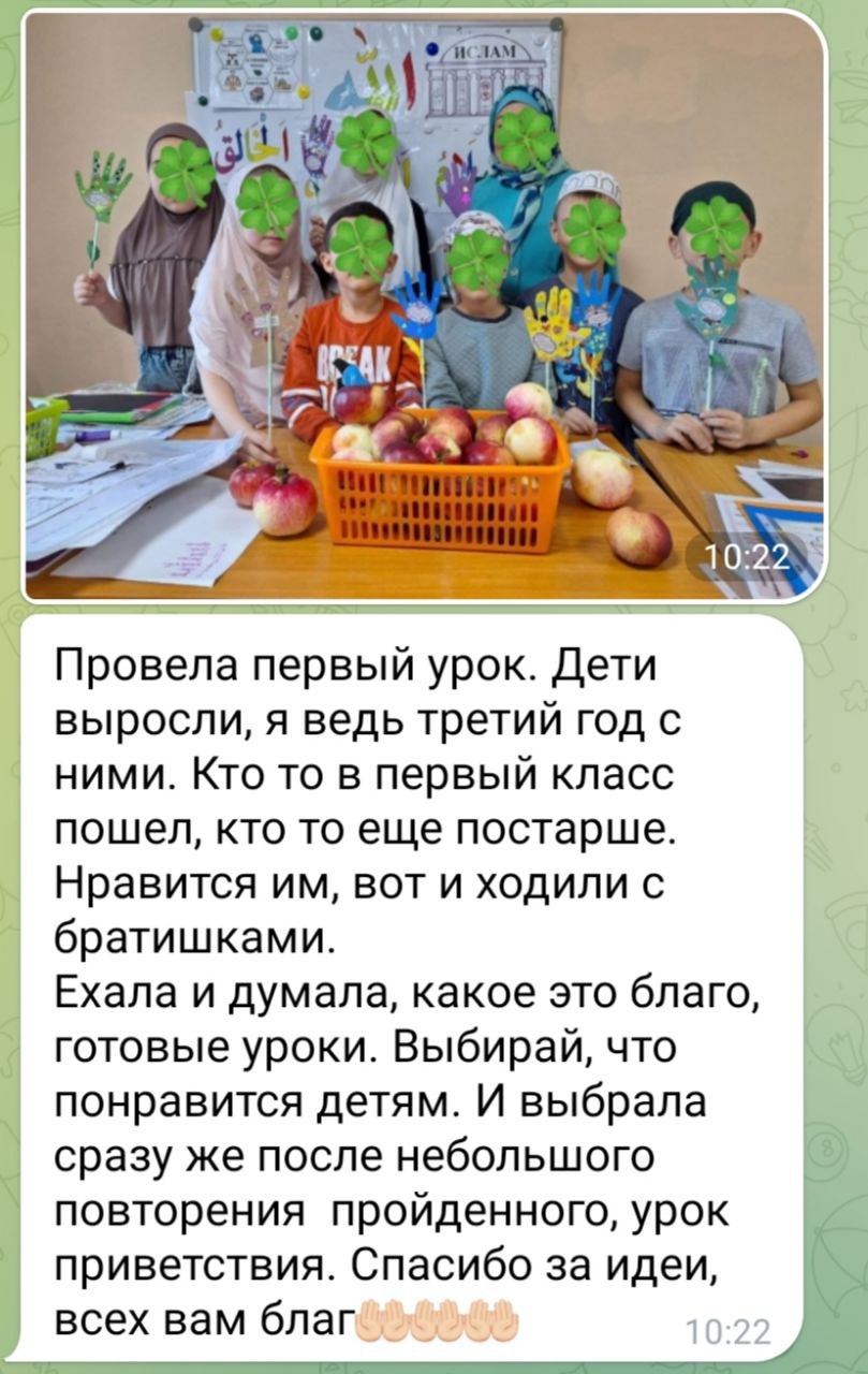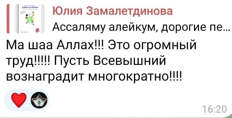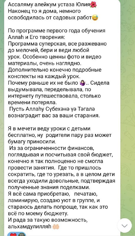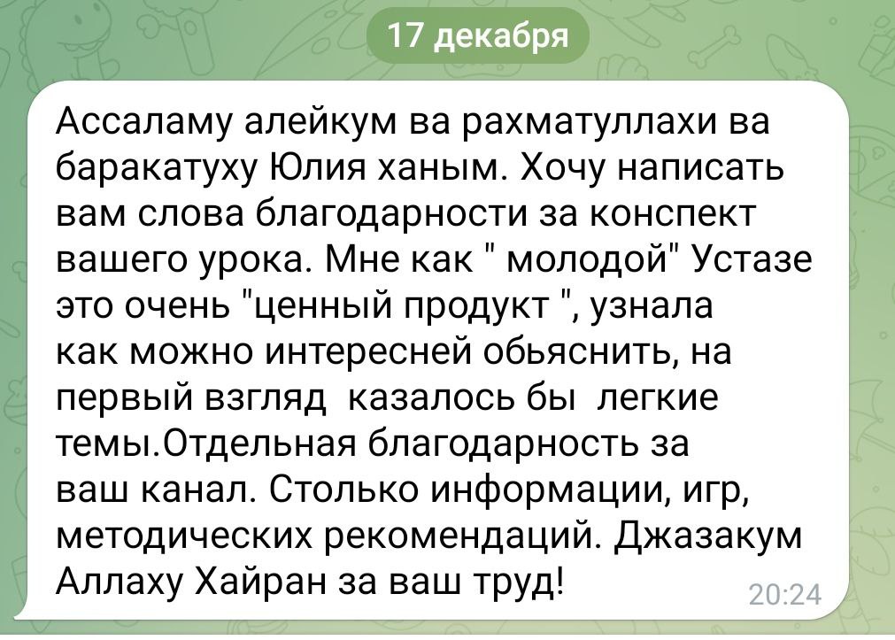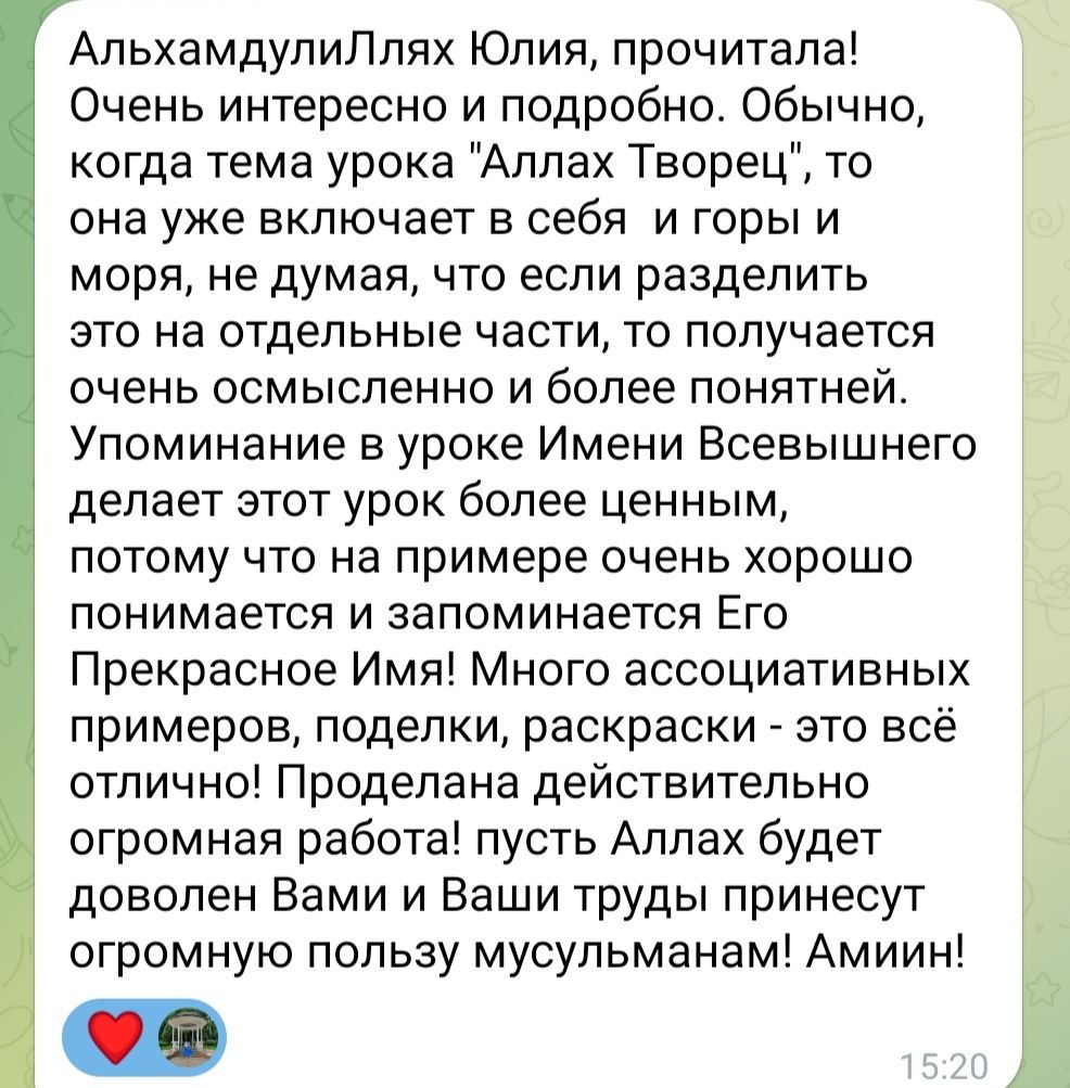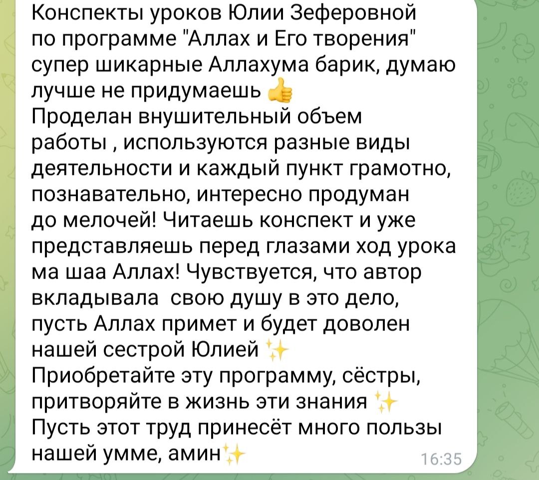 Отзыв коллеги: Ассаламу алейкум, уважаемые коллеги! Хочу поделиться с вами своим мнением. Может кого заинтересует. Приобрела дошкольную программу у Юлии ханум. Очень довольна и благодарна Юлие ханум за проделанную работу. Всё расписано чётко, понятно, доступно. Есть и игры, и эксперименты, и викторины, и теория. Материал можно распечатать и использовать на уроках. Есть нашид, хадисы, стихотворения. Детям очень нравится. Конспекты очень подробно расписаны. Конечно же, можете своё тоже добавлять, но основная часть уже готовая. РЕКОМЕНДУЮ