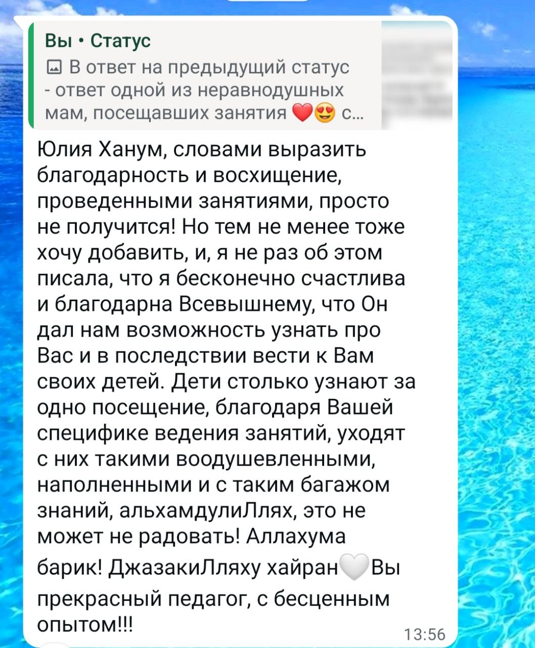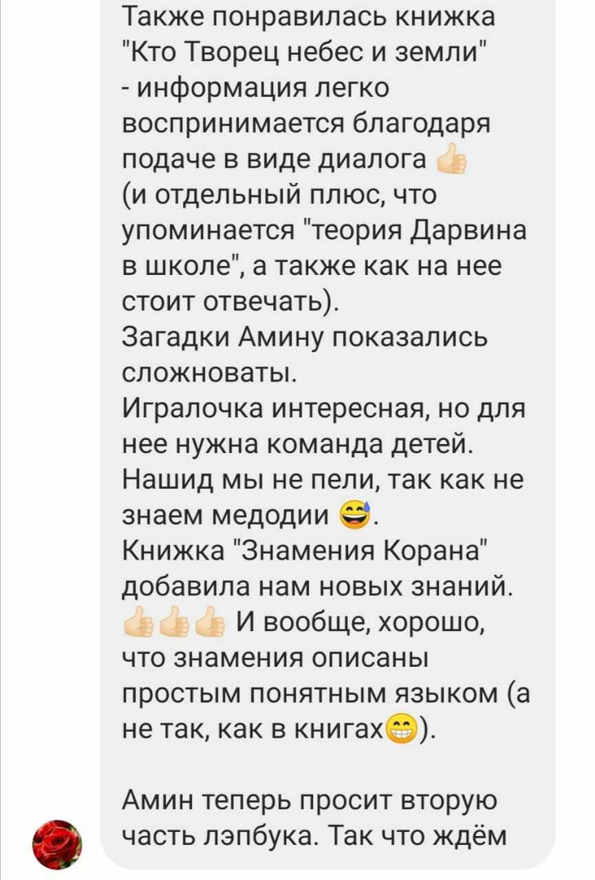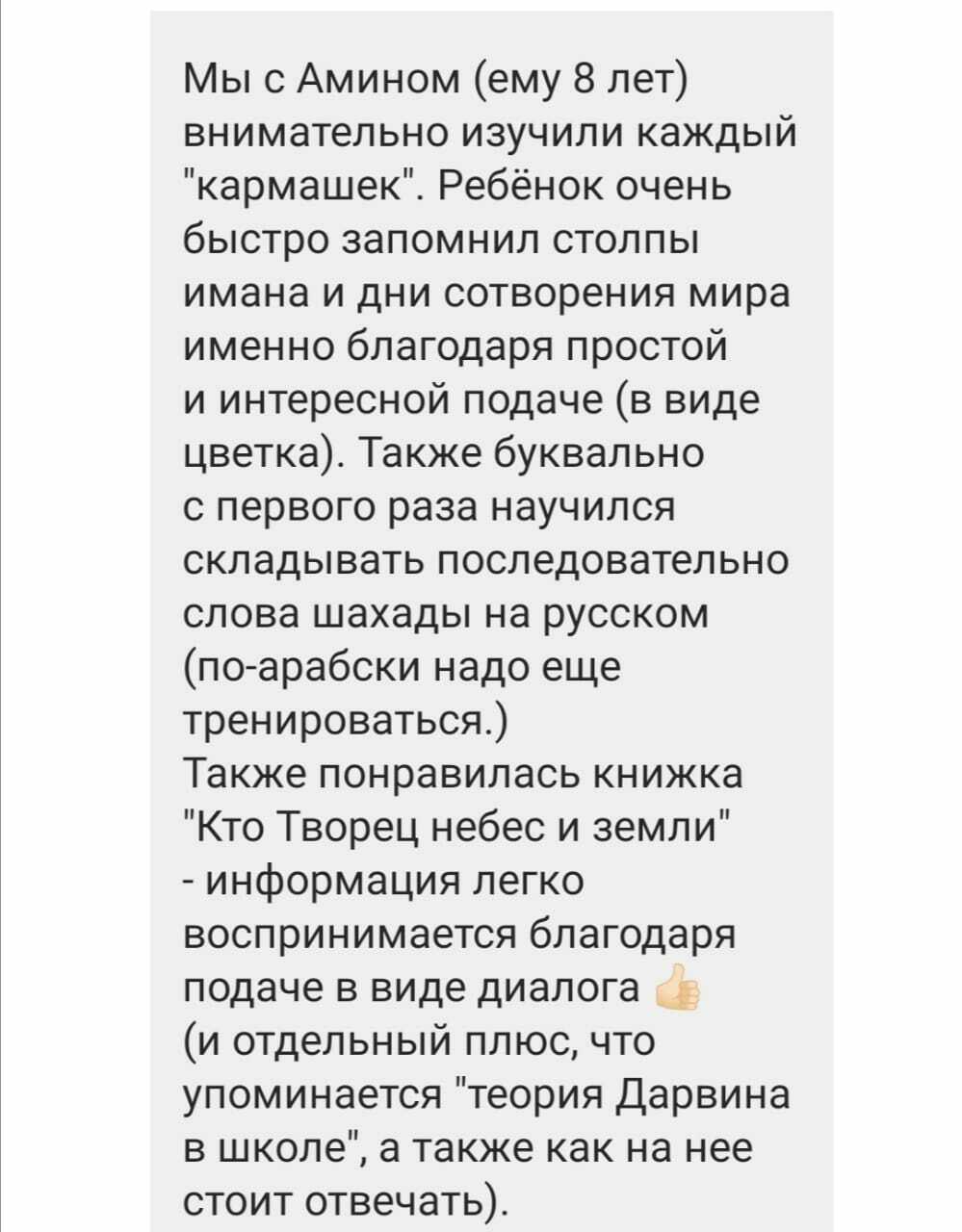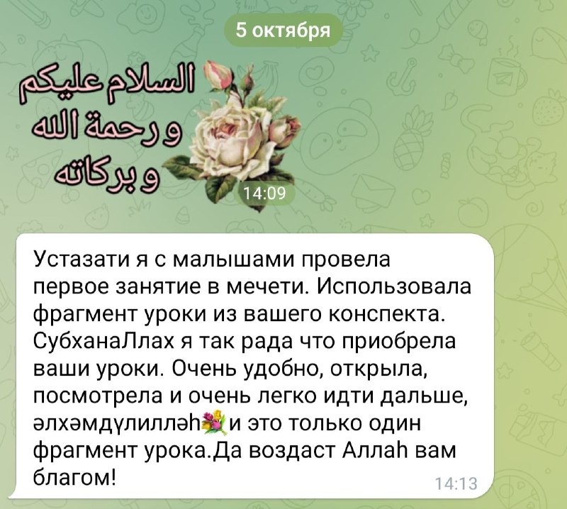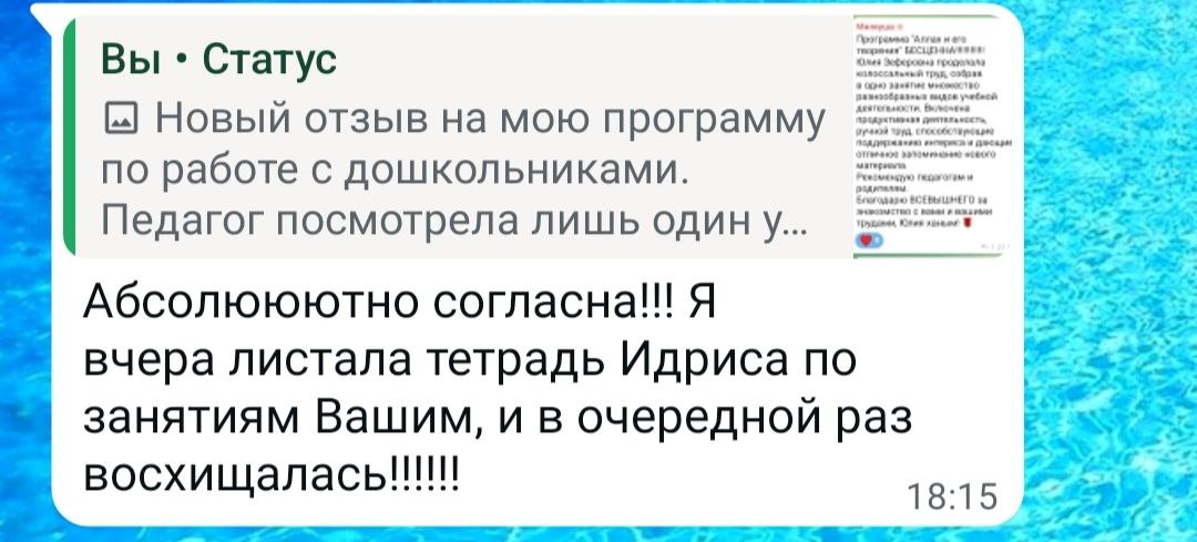 Отзыв коллеги: Ассаламу алейкум, уважаемые коллеги! Хочу поделиться с вами своим мнением. Может кого заинтересует. Приобрела дошкольную программу у Юлии ханум. Очень довольна и благодарна Юлие ханум за проделанную работу. Всё расписано чётко, понятно, доступно. Есть и игры, и эксперименты, и викторины, и теория. Материал можно распечатать и использовать на уроках. Есть нашид, хадисы, стихотворения. Детям очень нравится. Конспекты очень подробно расписаны. Конечно же, можете своё тоже добавлять, но основная часть уже готовая. РЕКОМЕНДУЮ