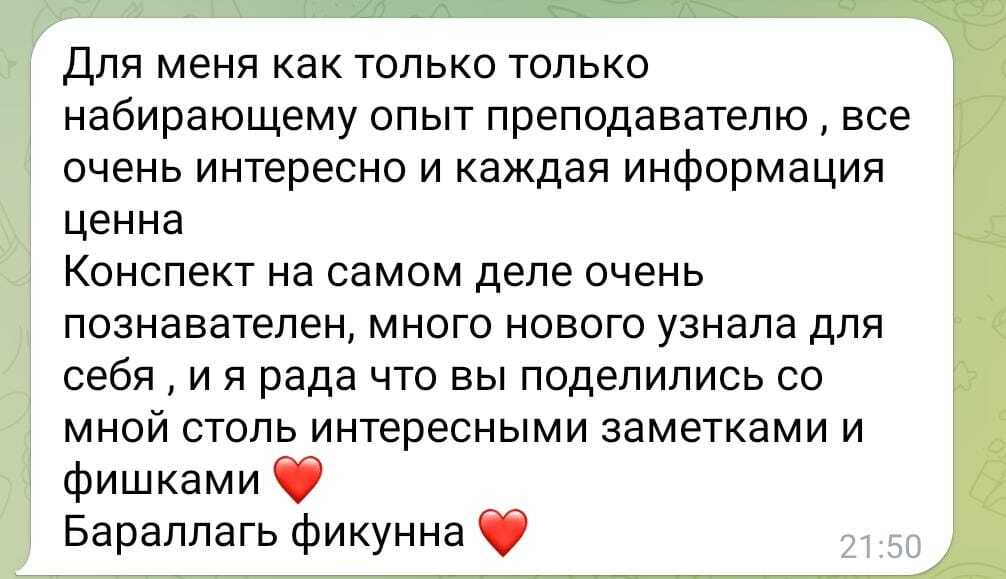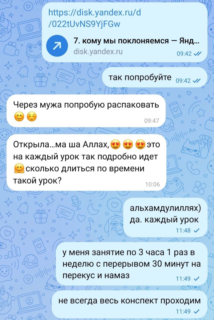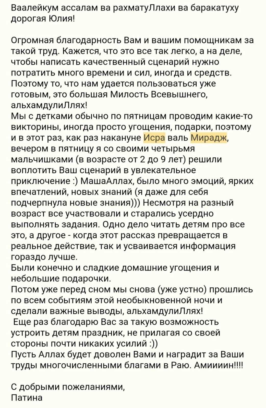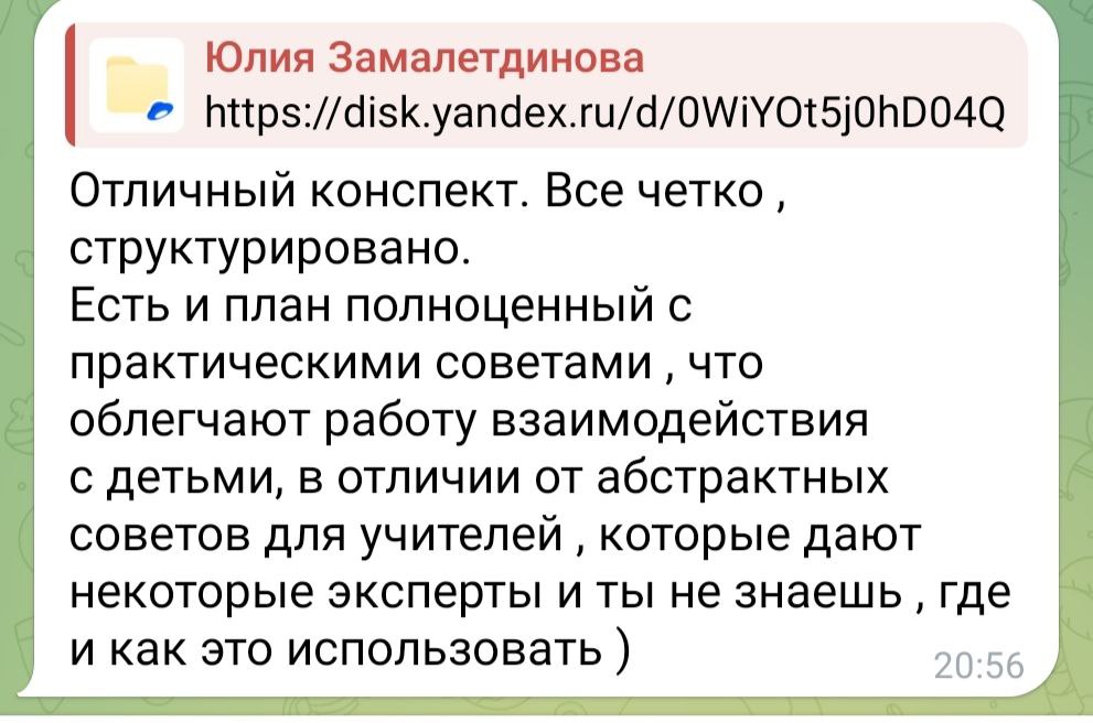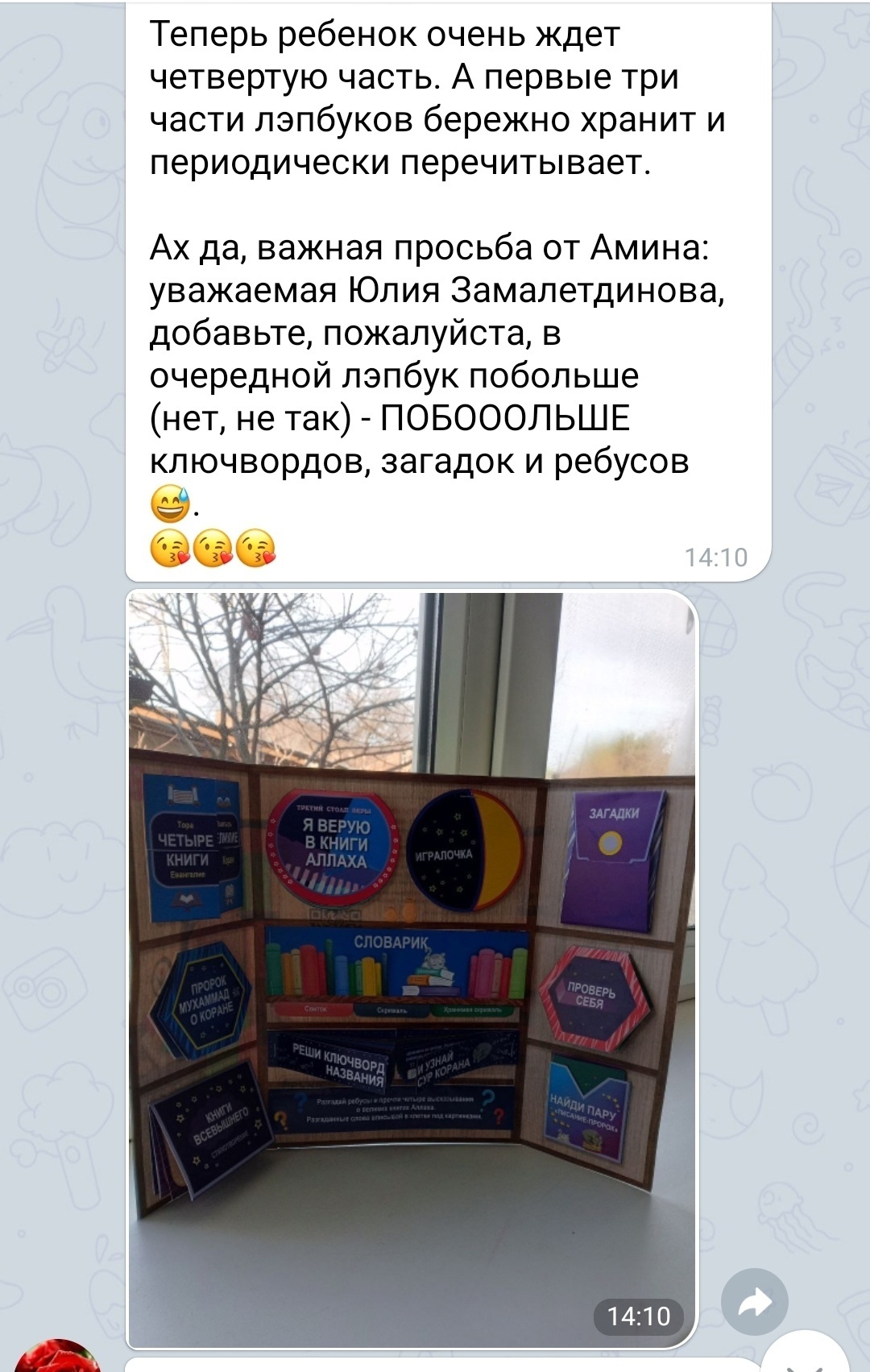Отзыв коллеги: Ассаламу алейкум, уважаемые коллеги! Хочу поделиться с вами своим мнением. Может кого заинтересует. Приобрела дошкольную программу у Юлии ханум. Очень довольна и благодарна Юлие ханум за проделанную работу. Всё расписано чётко, понятно, доступно. Есть и игры, и эксперименты, и викторины, и теория. Материал можно распечатать и использовать на уроках. Есть нашид, хадисы, стихотворения. Детям очень нравится. Конспекты очень подробно расписаны. Конечно же, можете своё тоже добавлять, но основная часть уже готовая. РЕКОМЕНДУЮ