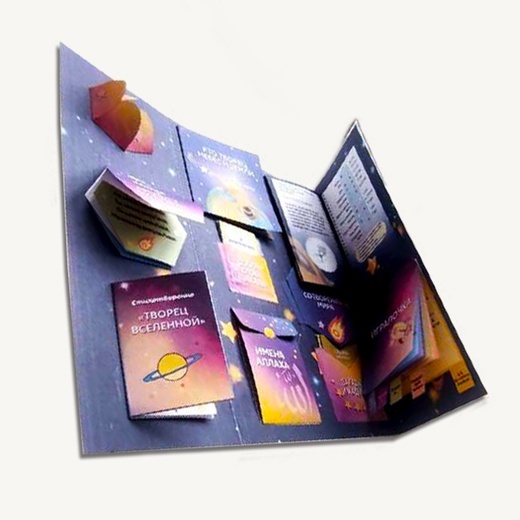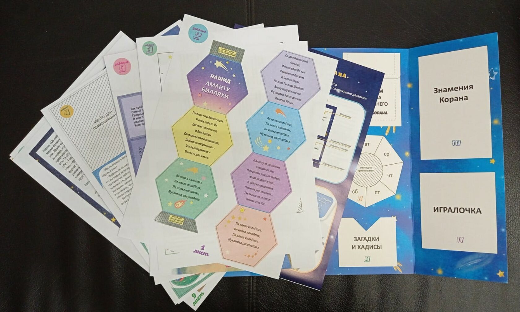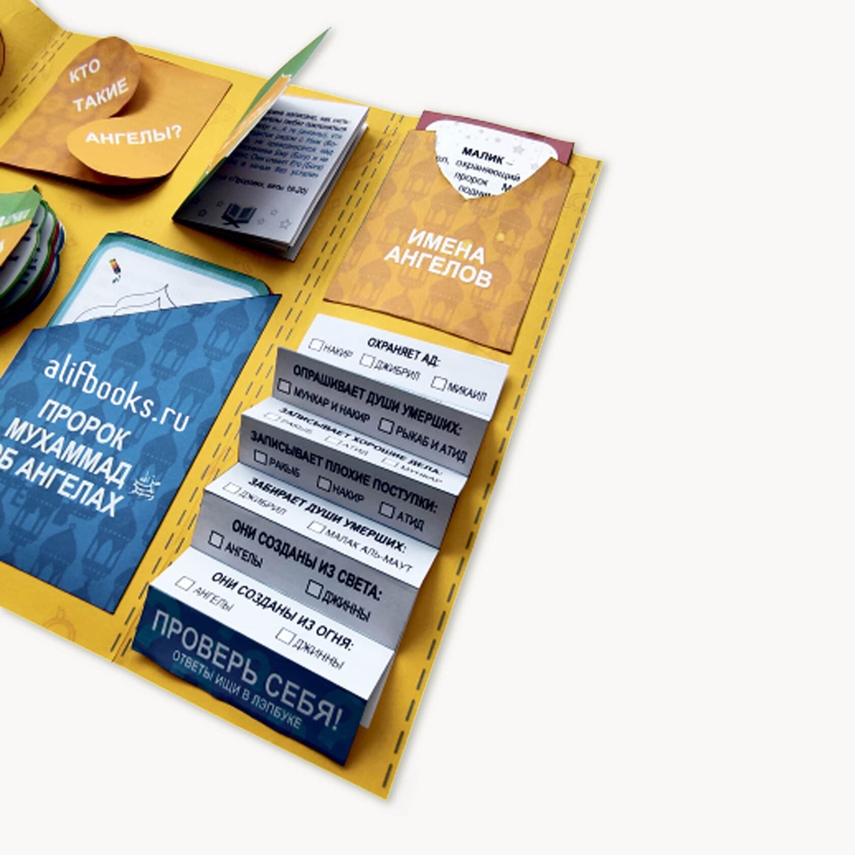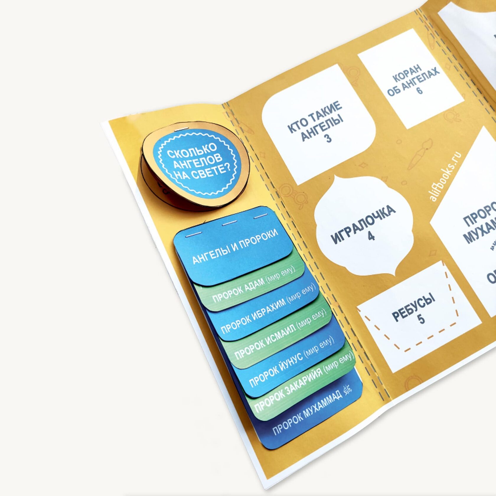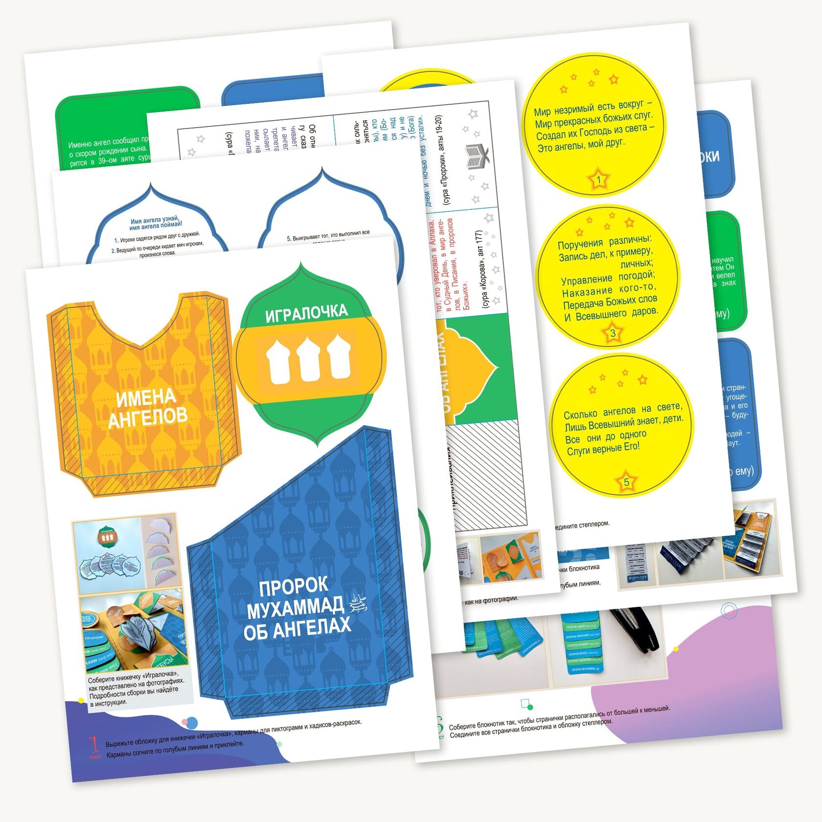 1. Мини-книжка стихотворение «Сколько ангелов на свете» 2. Блокнотик «Ангелы и пророки» 3. Мини-книжка «Кто такие ангелы» 4. Мини-книжка «Коран об ангелах» 5. Мини-книжка «Игралочка» 6. Кармашек с карточками «Ребусы» 7. Конвертик с карточками-раскрасками «Пророк Мухаммад ﷺ об ангелах» 8. Кармашек с карточками-пиктограммами «Имена ангелов» 9. Тест-раскладушка «Проверь себя» 10. Кармашек с карточками «Загадки»
