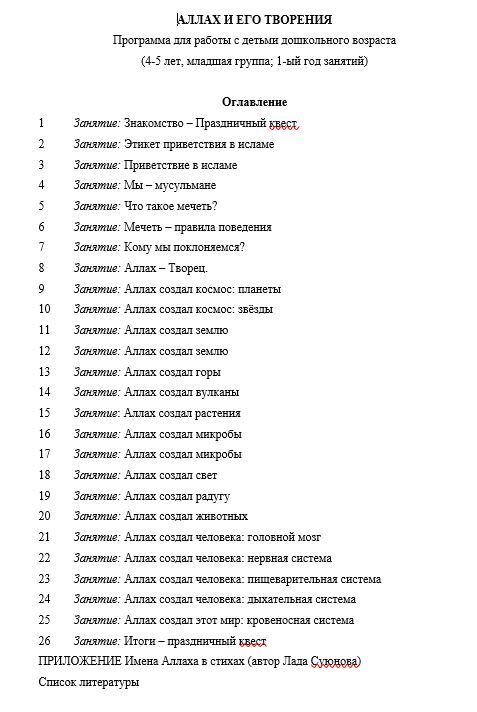 Программа для работы с дошкольниками "Аллах и его творения" (первый год занятий)