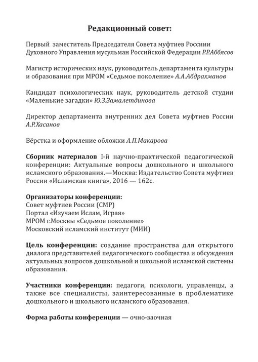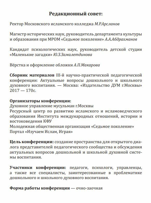 🌙Вторая конференция состоялась 27 мая 2017 года в первый день Рамадана в конференц-зале Культурно-досуговом и просветительском центре "Дар" (Москва). ⠀ 🎓На конференции приняли участие доктора, кандидаты наук; профессора, доценты; педагоги, психологи, управленцы, а также все специалисты, заинтересованные в проблематике дошкольного и школьного исламского образования. ⠀ 💌Я имею прямое отношение к данной конференции и к данному сборнику, как организатор и составитель. ⠀ 🌏В результате данной конференции создан сборник теоретических и практических материалов как очных, так и заочных участников. ⠀ 📮💻 Мы готовы поделиться электронной и(или) бумажной версией сборника. ⠀ 💳Цена электронной версии 100 руб. 💰Цена бумажной версии (книга) 200 руб. (+доставка) 📙Формат: А5 📖Кол-во стр.: 170 ⠀ 📝Для заказов пишите в ЛС ⠀ 📩Также материалы можно скачать и посмотреть в группе ВК "Виртуальная учительская". Ссылку на группу можно посмотреть в разделе ссылки группы "Изучаем Ислам, Играя" или пишите, дам ссылку. Название группы периодически меняю, поэтому на название не всегда можно ориентироваться.