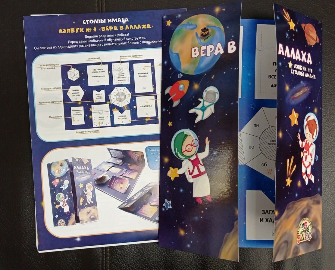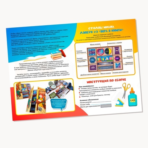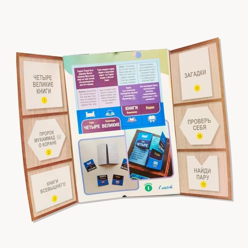 Лэпбук «Вера в Книги» включает в себя: 1. Книжка-раскладушка "Четыре великие Книги" 2. Книжка-раскладушка с хадисами 3. Мини-книжка-стихотворение "Книги Всевышнего" 4. Мини-книжка "Я верую в Книги Аллаха" 5. Блокнотик с играми "Игралочка" 6. Мини-книжка "Словарик" 7. Двойная мини-книжечка "Реши ключворд и узнай названия сур Корана" 8. Книжка-раскладушка "Ребусы" 9. Конвертик с карточками "Загадки" 10. Книжка-раскладушка "Проверь себя" 11. Кармашек с карточками "Найди пару: Писание и Пророк"