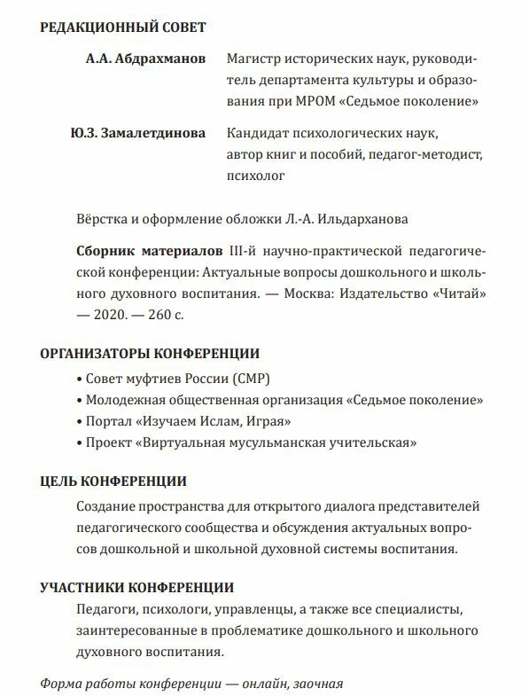 📚Сборник материалов Третей научно-практической конференции "Актуальные вопросы дошкольного и школьного исламского образования". ⠀ 💌Я имею прямое отношение к данной конференции и к данному сборнику, как организатор и составитель. ⠀ 📆Третья Конференция состоялась 29 августа 2020 года в онлайн формате ⠀ 📕В результате данной конференции создан сборник теоретических и практических материалов. ⠀ 📮Бумажный вариант книги ещё не выпущен. ⠀ 💻Но мы готовы поделиться электронной версией сборника. ⠀ 📙Формат: А5 📖Кол-во стр.: 260