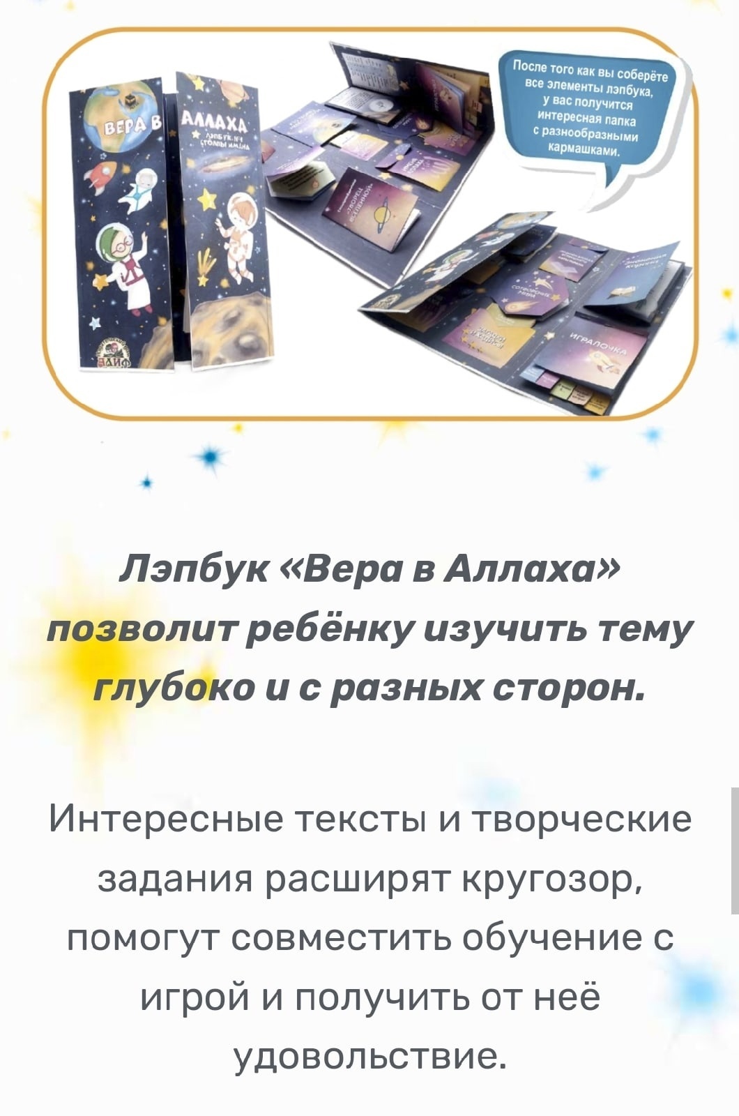 Интересные тексты и творческие задания расширят кругозор, помогут совместить обучение с игрой и получить от него удовольствие. ⠀ Ребята познакомятся с аятами Корана и достоверными хадисами о первом столпе веры. Они прочитают интересные научные факты. Выучат слова шахады и нашид, которые помогут понять и запомнить свидетельство вероубеждения. ⠀ Выполнение заданий поможет лучше узнать имена Аллаха. Загадки, раскраски, стихотворения развивают мышление, память и воображение, способствуют развитию речи. ⠀ Лэпбук «Вера в Аллаха» включает в себя: