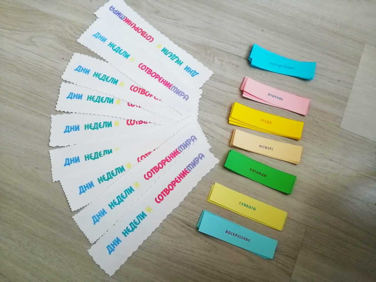 d) Названия дней недели на цветной бумаге размером 3*12 см