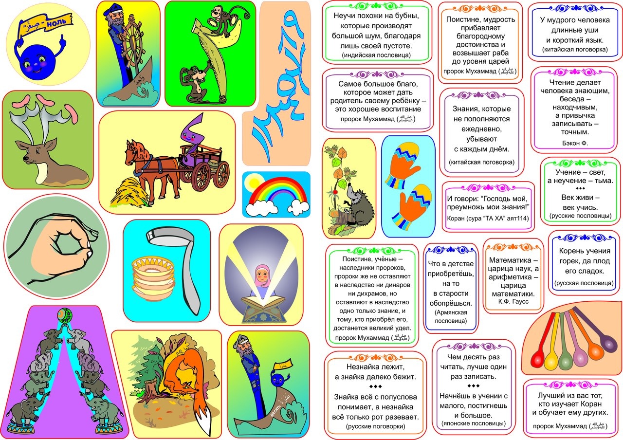 круглые пиктограммы «дерево», «микробы», «свет», «животные», «человек», «Земля», «горы», диаметром 2,5-3 см. (см. лэпбук №1 «Вера в Аллаха» (из-во «Алиф»)